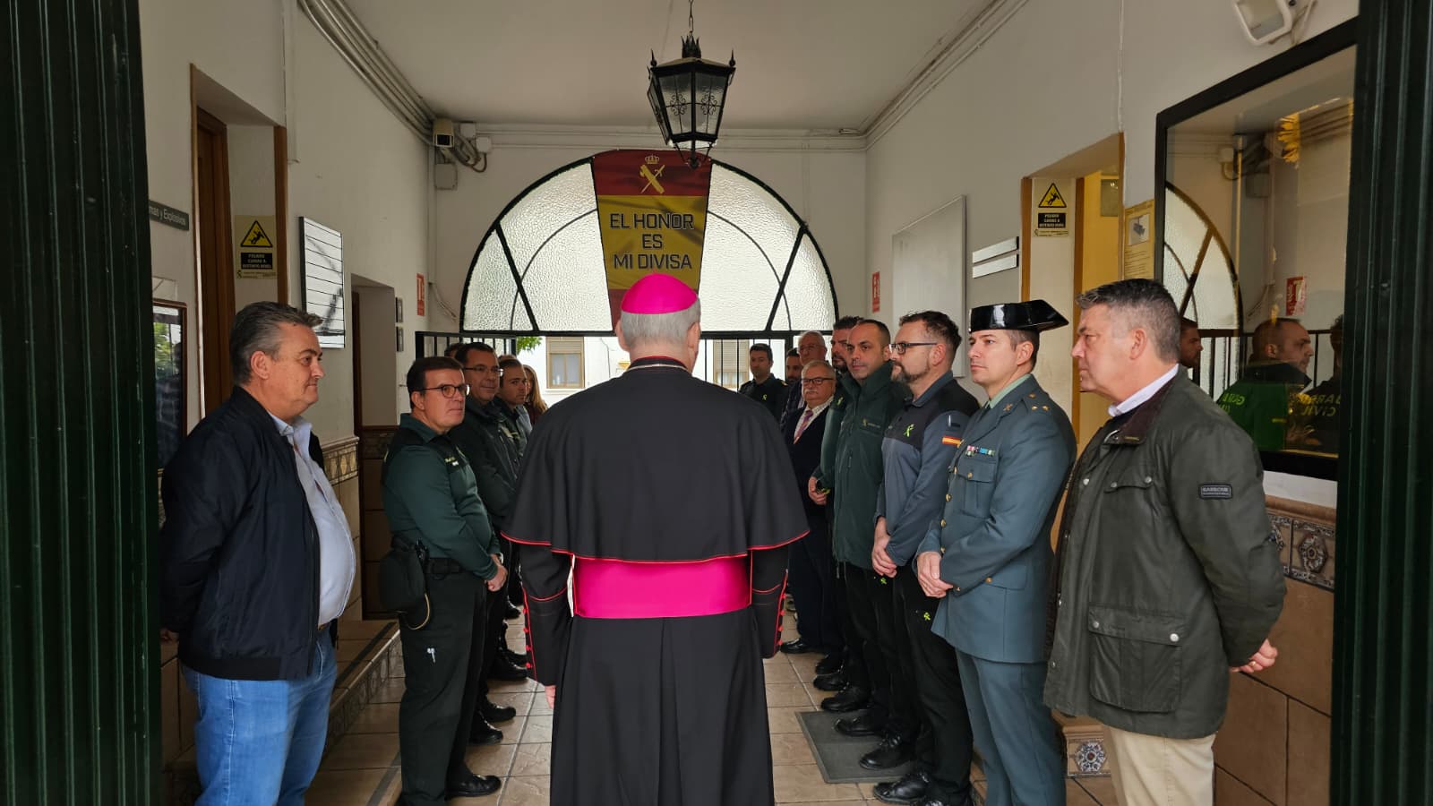 Durante la mañana, Don Sebastián pudo conocer de cerca todas estas realidades. Comenzó visitando la Casa Cuartel de la Guardia Civil de Martos, que pertenece a nuestra demarcación parroquial y acoge a la Sexta Compañía, con numerosas áreas de intervención como SEPRONA, Policía Judicial, antidroga o tráfico. El joven Teniente Yeray Lapuente, comandante de puesto, lo esperaba junto con sus guardias.