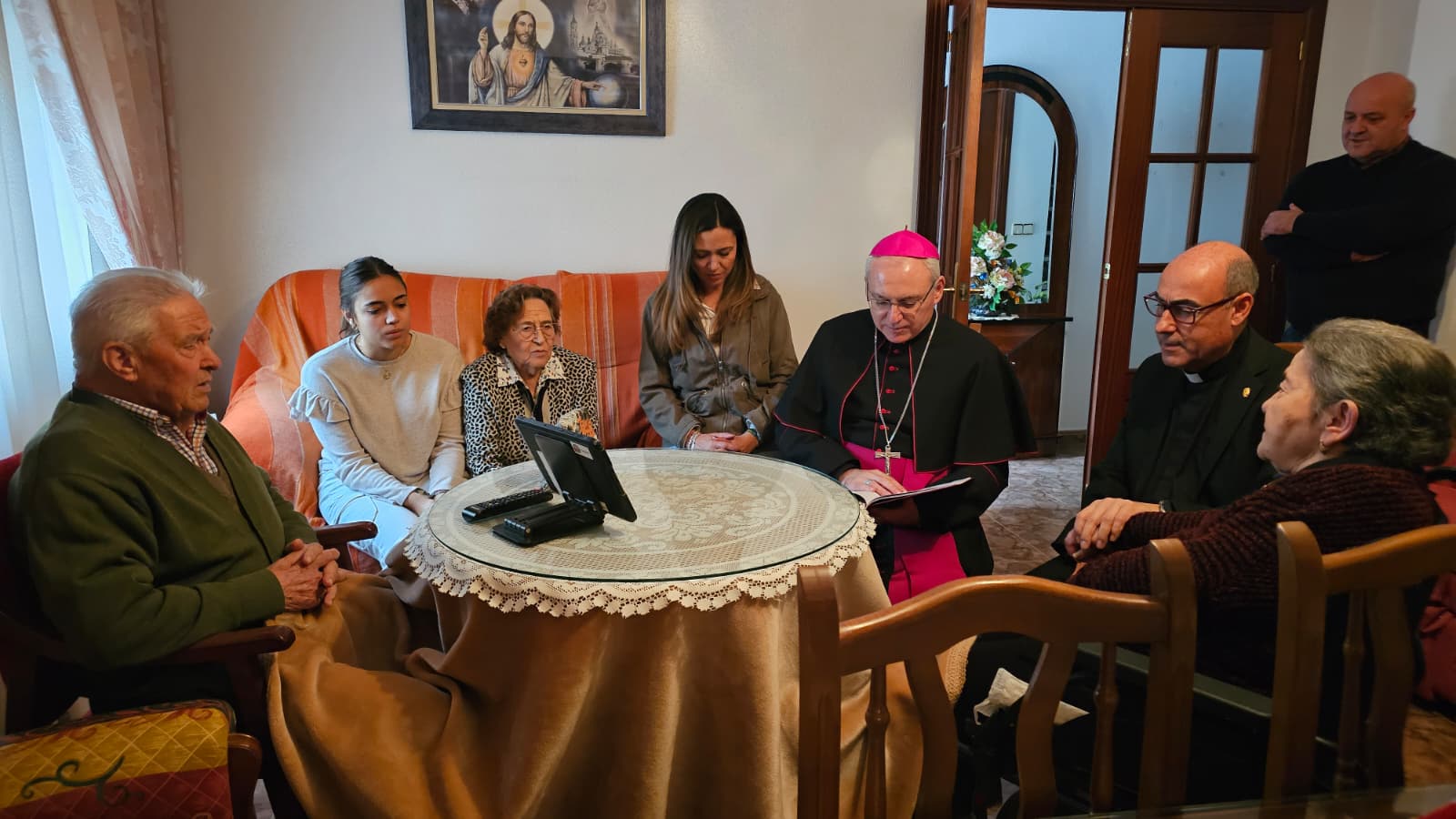 La mañana concluyó con la visita a tres enfermos de la parroquia. Primero visitó a Encarnita Martínez, pilar fundamental de esta comunidad, que hoy apenas puede valerse por sí misma, pero sigue amando a San Juan de Dios con la misma pasión y cuidando de su parroquia desde el sillón de su casa. También, compartió un momento de consuelo y fe con Pedro y Ana, un matrimonio marcado por el sufrimiento y el dolor físico, pero que vive su amor con una entrega ejemplar. Finalmente, estuvo con Luisa, una hermana de la comunidad desgastada por los años y por la entrega generosa con la que sacó adelante a su numerosa familia de nueve hijos.