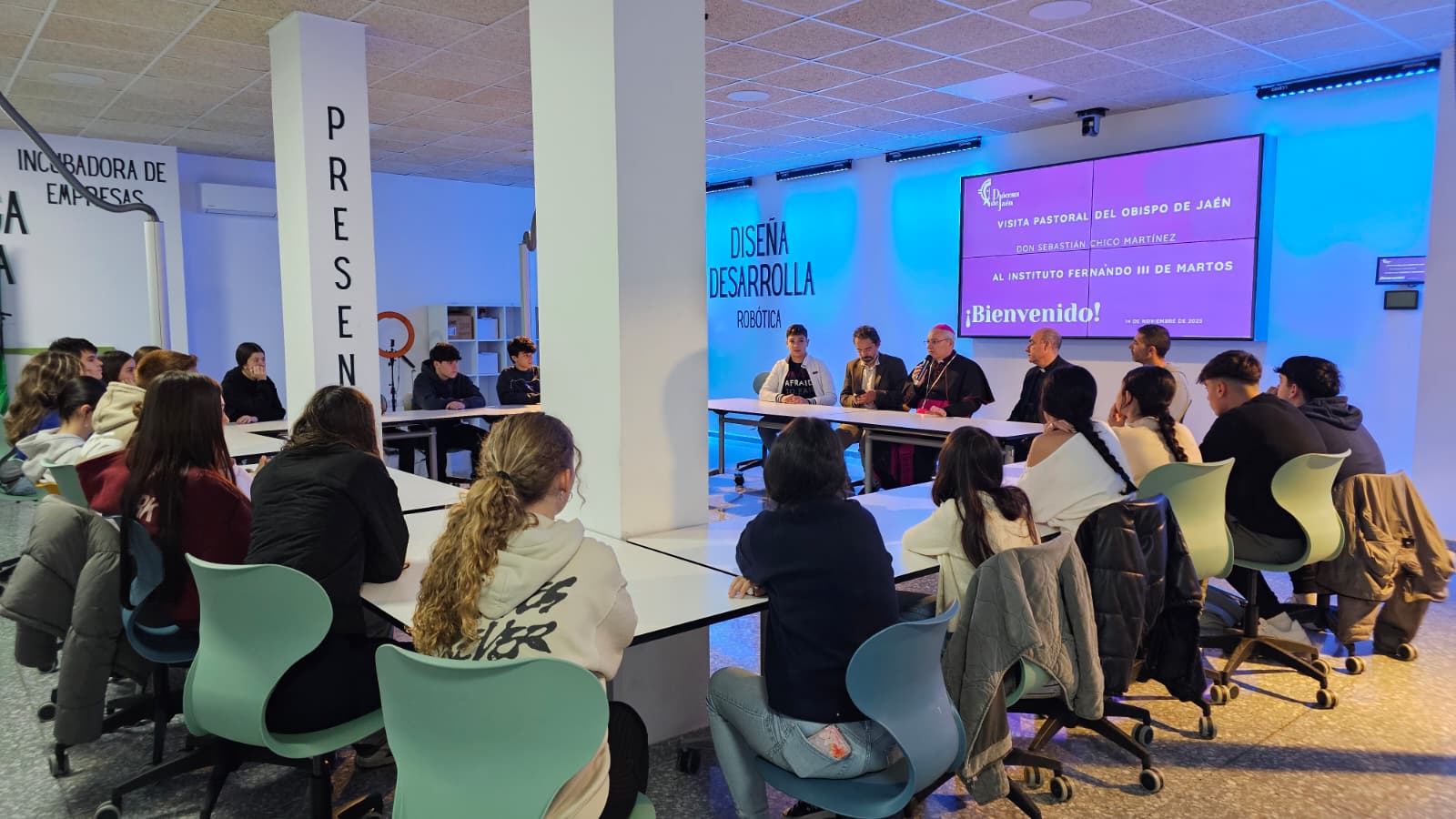Después de unos encuentros ten emotivos, el Obispo cambió de ambiente para visitar el Instituto de Enseñanza Secundaria y Profesional Fernando III, declarado de alta calidad por su nivel y tecnología. Su director, D. Manuel Caballero, acompañado por el jefe de estudios, D. Jesús Bueno, mostró al Prelado cómo se trabaja en Martos con vocación y profesionalidad con adolescentes y jóvenes. Es impresionante el mundo de la tecnología y los módulos de Formación Profesional, especialmente el “pequeño Valeo”, un módulo de fabricación de moldes de plástico que capacita a los jóvenes para trabajar en fábricas y empresas de automoción.