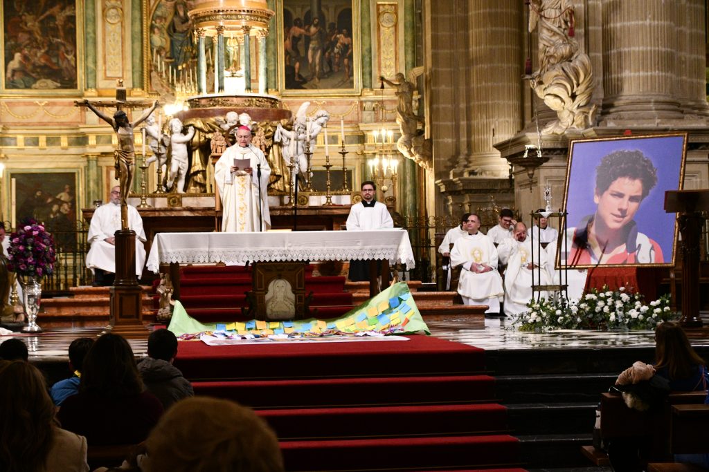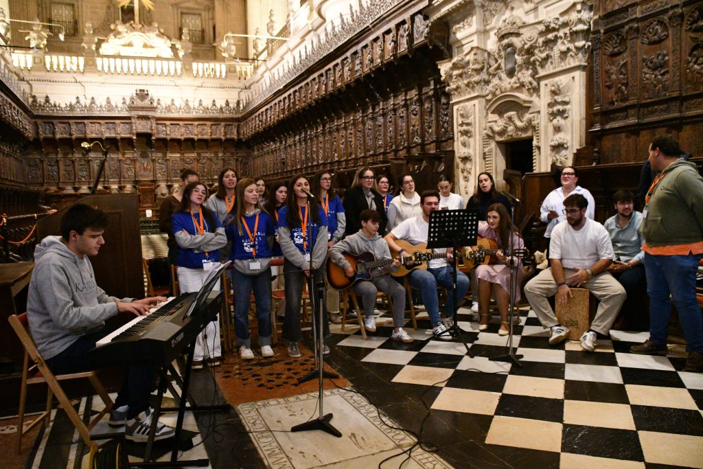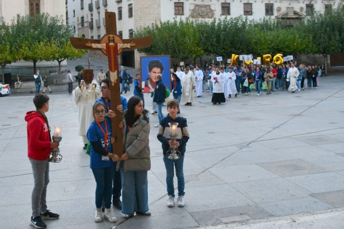 Un momento especialmente emotivo fue cuando Don Sebastián habló de su patrón, san Carlo Acutis, recientemente canonizado, a quien presentó como ejemplo luminoso para los jóvenes de hoy. “El Santo Padre lo presentó como un joven enamorado de Jesús y dispuesto a dar todo por Él”. Y añadió: “su vida demuestra que la santidad no es cosa de viejos, ni de personas separadas del mundo, ¡sino de adolescentes como vosotros!” Y en este sentido citó una de las frases más conocidas del nuevo santo: “Cuando nos ponemos ante Jesús en la Eucaristía, nos convertimos en santos”, exhortando a los jóvenes a descubrir que la santidad se construye en lo cotidiano: “en el estudio, el deporte, el grupo, el servicio, la familia… Él vivía su vida diaria integrado en todo eso, y la transformó con su amistad con Cristo”.