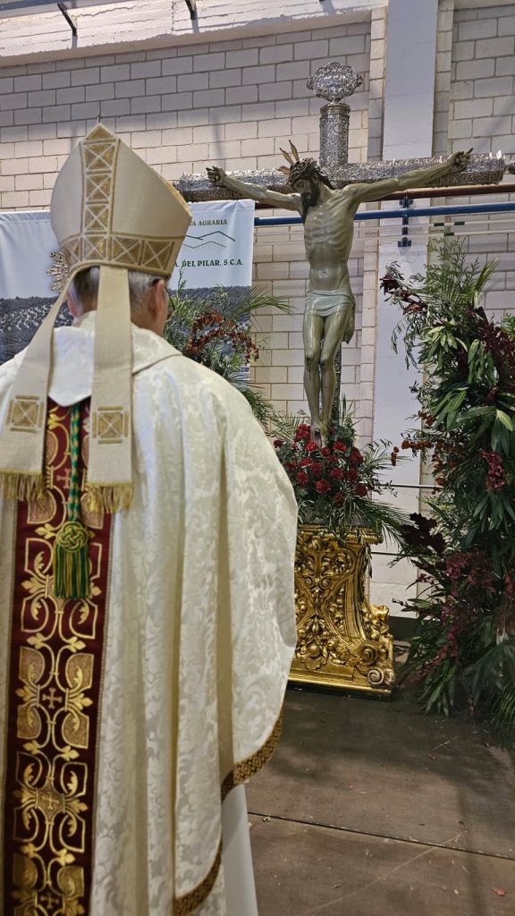 La mañana fría y la cosecha de la aceituna ya comenzada no impidió que más de 600 personas participasen en el amplísimo recinto de la bodega de esta cooperativa del Pilar en la celebración eucarística. En esta Misa estaban presentes el alcalde de Villacarrillo, D. Francisco Miralles y miembros de la corporación municipal; la Delegada Territorial de la Junta de Andalucía de Agricultura, Pesca, Agua y Desarrollo Rural en Jaén, Dª. Soledad Aranda; los representantes de las Juntas Rectoras de las tres cooperativas de Villacarrillo: Santísimo Cristo de la Vera-Cruz, Nuestra Señora del Rosario y Nuestra Señora del Pilar, y de la cooperativa San Vicente de Mogón; la Hermana Mayor Dª. María Dolores Ceacero y la Junta de Gobierno de la Real Archicofradía Patronal del Santísimo Cristo de la Vera-Cruz, juntamente con los hermanos mayores, costaleros, y miembros de las juntas de gobierno de las nueve cofradías de Villacarrillo.