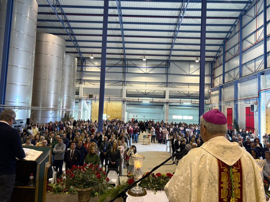 Este domingo, 23 de noviembre, solemnidad de Cristo Rey, se ha celebrado esta Santa Misa en el impresionante edificio de la bodega de la cooperativa de Nuestra Señora del Pilar, rodeados de los inmensos depósitos que contienen nuestro oro líquido, nuestro aceite de oliva.
