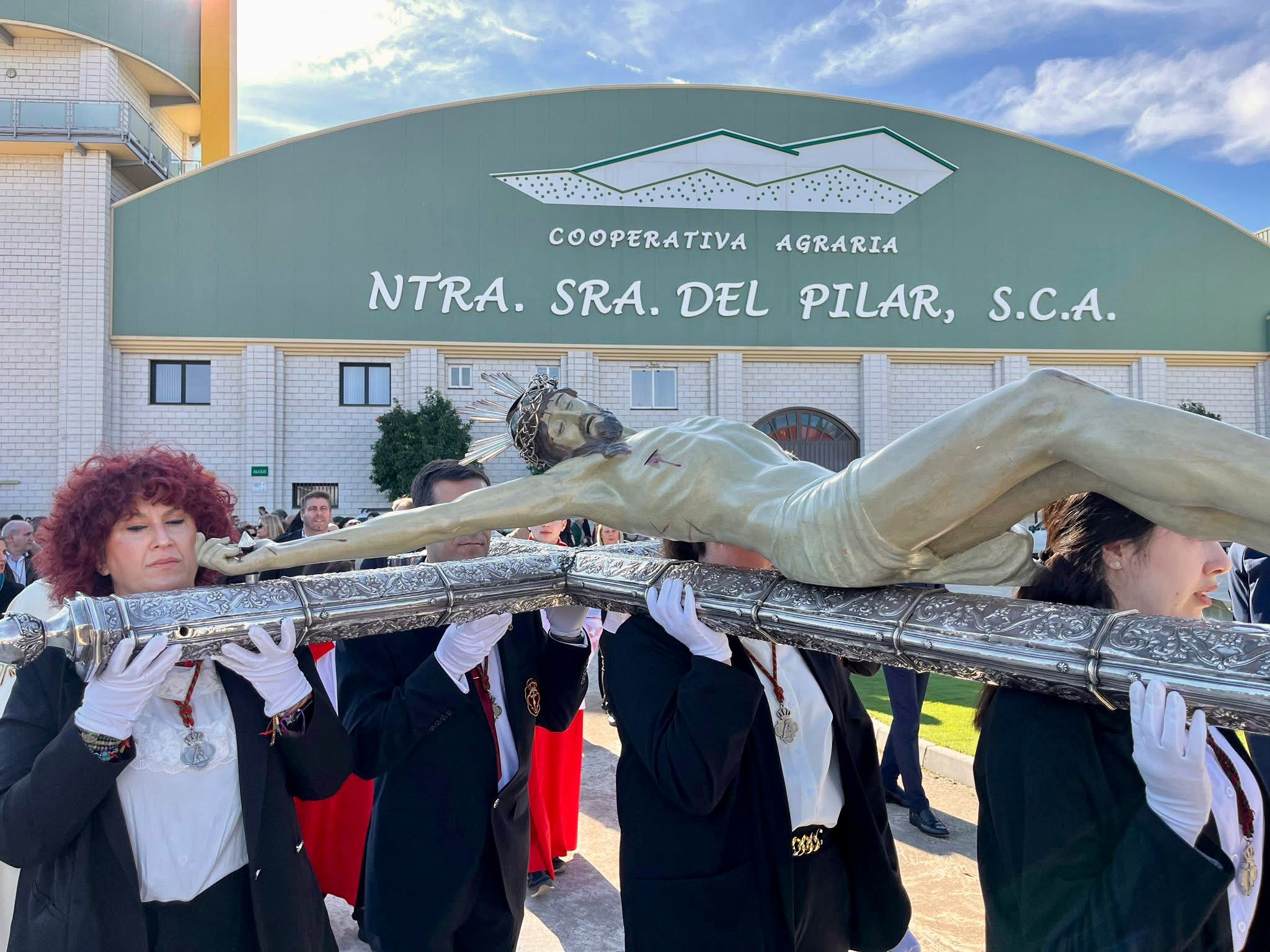 A las 11 de la mañana, la imagen del patrón de Villacarrillo, el Santísimo Cristo de la Vera-Cruz, portado por sus costaleros y costaleras, fue llevado desde el edificio de las oficinas de la cooperativa hasta la bodega, con el acompañamiento musical de la Asociación “Cristóbal Marín” de Villacarrillo. Junto a los depósitos de aceite y con un característico aroma a nuestro oro líquido, esta sagrada imagen del Santísimo Cristo de la Vera-Cruz que tanta devoción suscita en Villacarrillo, fue entronizada en el escenario que sirvió de presbiterio y que estaba bellamente decorado con la ornamentación floral de claveles rojos y ramos de olivo.