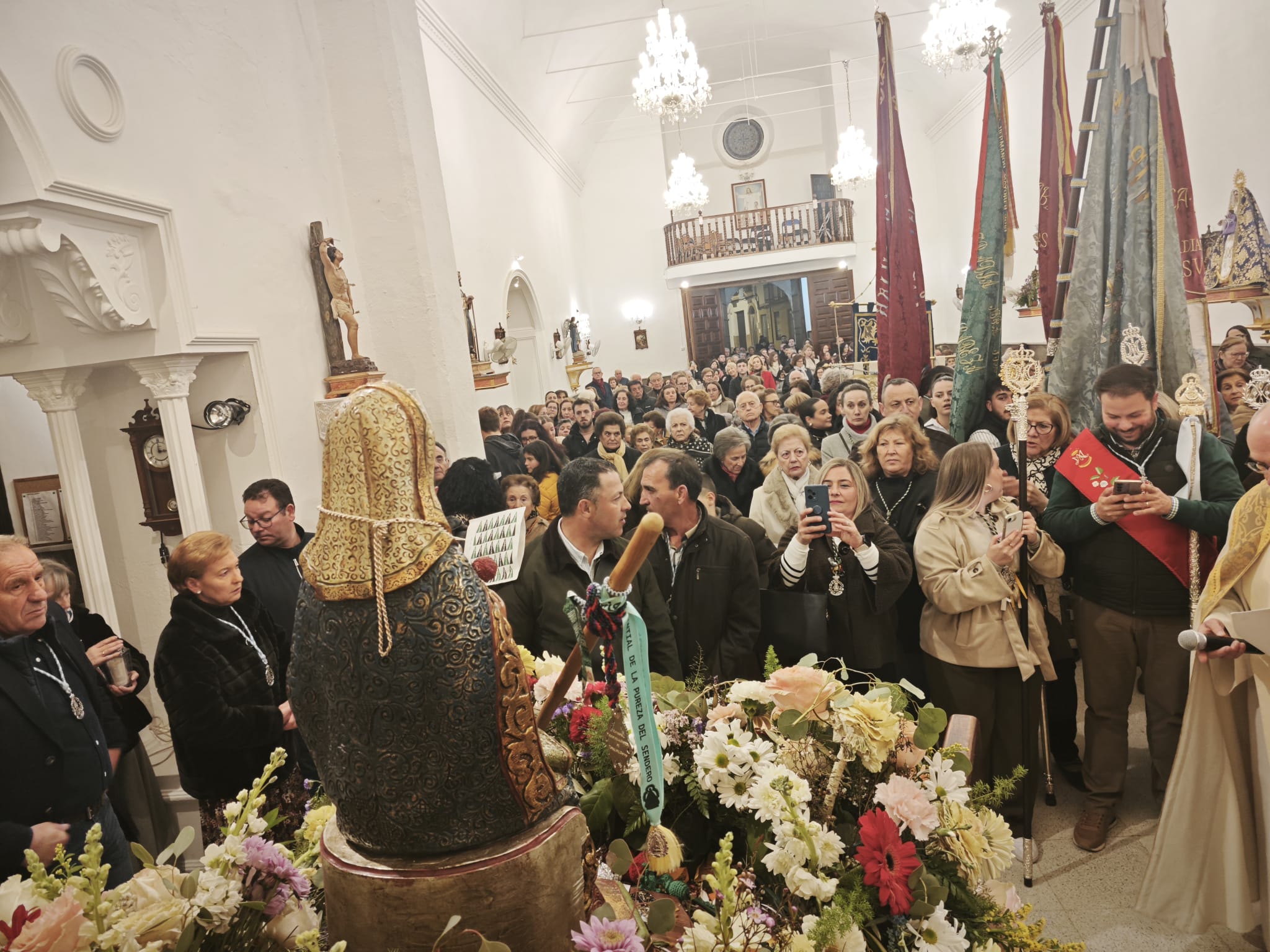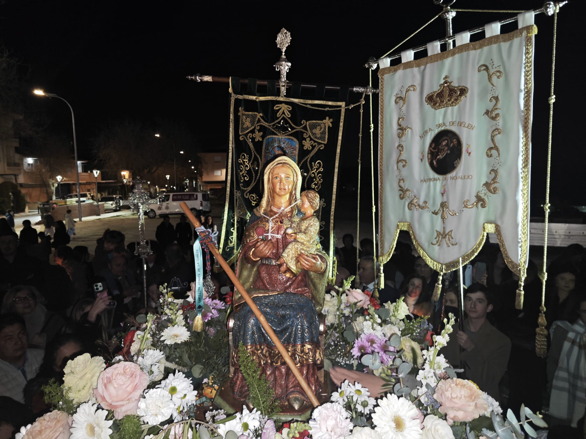 Desde allí partió la procesión de traslado hacia la parroquia, presidida por el señor obispo y en la que participó el párroco de Noalejo, D. Juan Jiménez Lomas, autoridades municipales, la Cofradía de la Virgen de la Cabeza, los grupos parroquiales de la Virgen de Belén y del Rosario, Adoración Nocturna, Marías de los Sagrarios y cientos de fieles devotos de todas las edades arropando, con velas encendidas, con devoción y oración, a la Madre de Dios. Acompañaron también el cortejo las cofradías de la Virgen de la Cabeza de Benalúa de las Villas y Montillana.