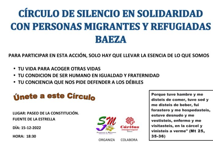 La ciudad de Baeza acoge el primer Círculo de Silencio en solidaridad con personas migrantes y refugiadas. Este evento es fruto del desarrollo del proyecto de sensibilización sobre la pastoral de Migraciones entre Cáritas interparroquial de Baeza y la Delegación de Migraciones de la Diócesis.