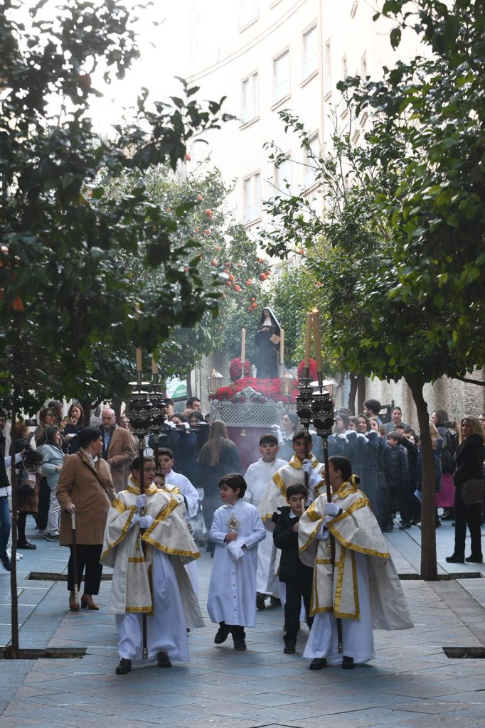 Del colegio salían en procesión hasta la Catedral, con la imagen de Santa Joaquina, un numeroso grupo de alumnos y alumnas, de profesores; junto al director del centro, D. José Antonio Cobo y el párroco y capellán, D. Rogelio Garrido Checa.
