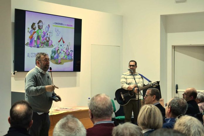 Fano y Unai Quirós acercaron el contenido del documento final de la XVI Asamblea General Ordinaria del Sínodo de los Obispos a los fieles, sacerdotes y consagrados de la diócesis de Tortosa a través de la palabra, el dibujo y la música.