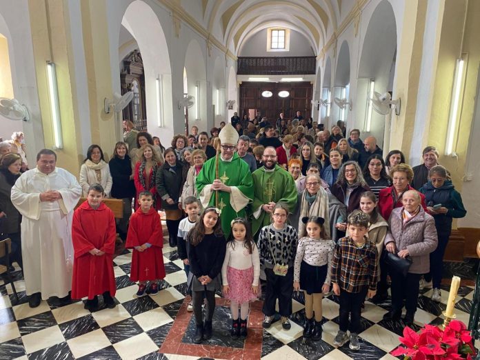 El domingo 18 de enero, a mediodía, llegaba el Obispo de Málaga a la parroquia que lo recibía con ilusión en la puerta. Tras besar la cruz parroquial y bendecirlos con agua, entró con ellos al templo mientras charlaba con ellos. El coro de la parroquia preparó con esmero los cantos de la Eucaristía en la que participaron todos los grupos de la parroquia: catequistas, niños, mayores… y las Misioneras del P. Soto que trabajan pastoralmente en el pueblo.