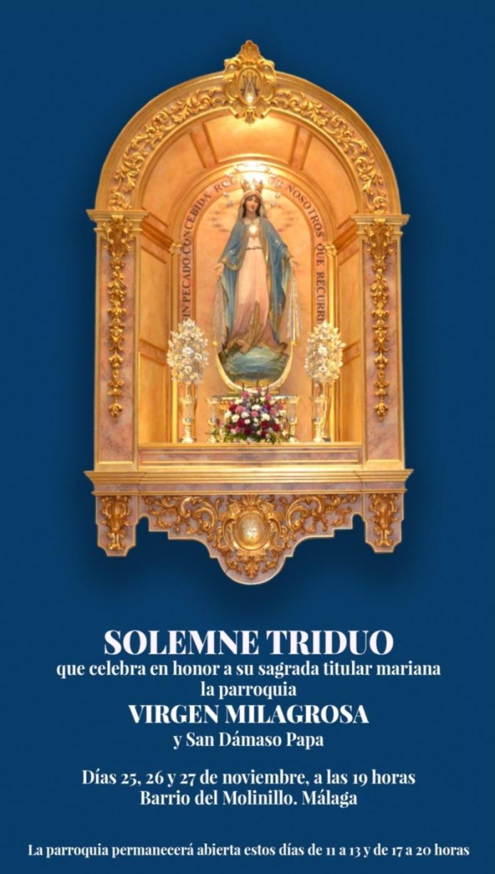 La parroquia Virgen Milagrosa y San Dámaso Papa, ubicada en la calle Almona de Málaga, en el barrio de El Molinillo, celebra un año más sus cultos con motivo de esta festividad mariana que tienen lugar del 25 al 27 de noviembre.
