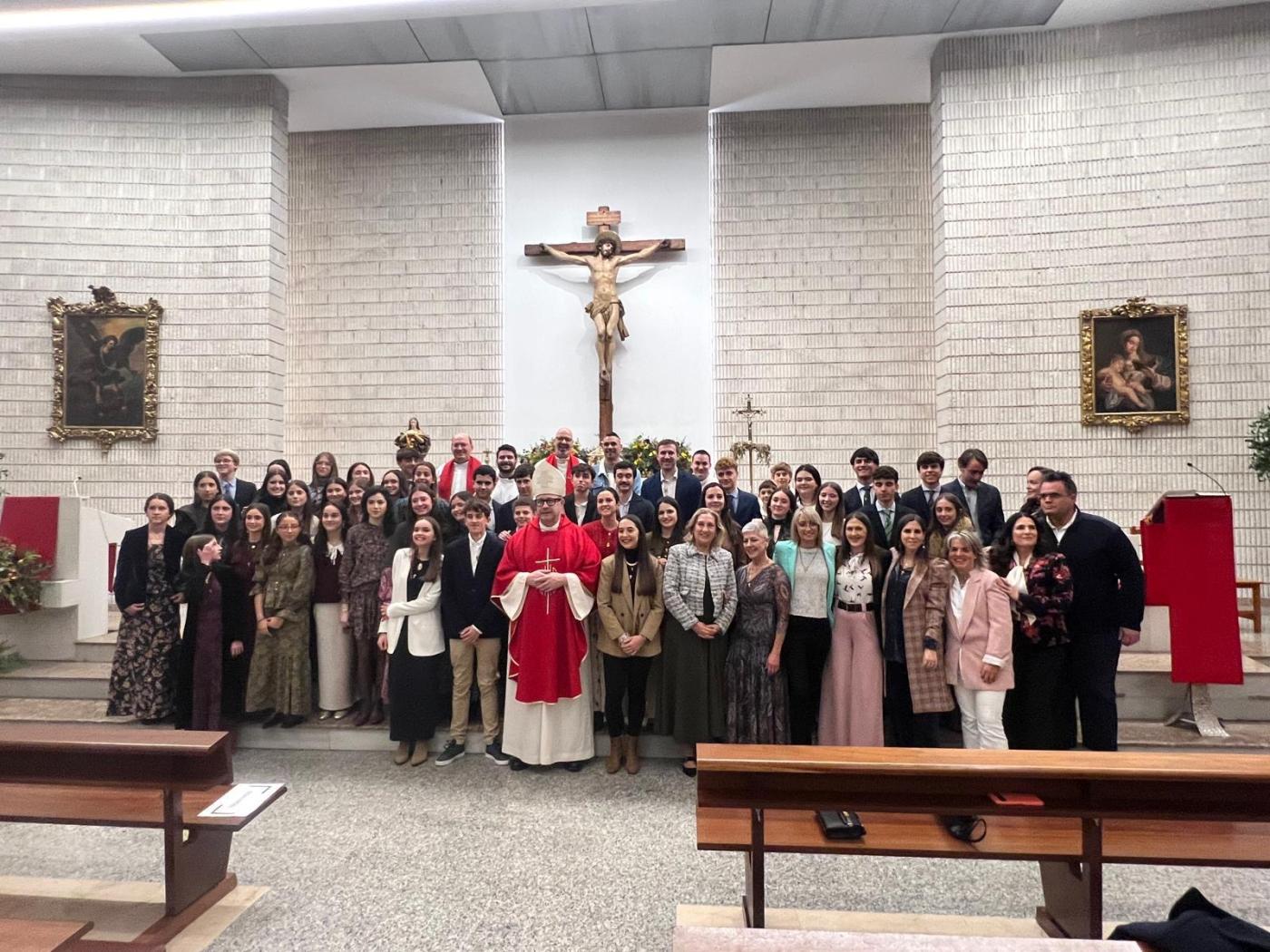 Son 11 adultos y jóvenes, algunos en Secundaria y Bachillerato, los que recibieron el domingo a las 19.30 horas, en una celebración presidida por el Obispo y concelebrada por el párroco, Alejandro Escobar. Entre las personas confirmadas, hay, explica el párroco, una madre de familia, una joven de la residencia de las Hijas de María Inmaculada en calle Victoria, un joven profesor y estudiantes, la mayoría universitarios. Alejandro Escobar comparte que el origen de muchos de ellos viene de una consulta realizada en la feligresía: «Surgió de los fieles que vienen a Misa los domingos por la tarde, donde observamos desde hace tiempo que acuden muchos jóvenes, Entre ellos hemos hecho una consulta, un sondeo distribuido por código QR, y que ha recibido 78 respuestas de jóvenes. Sus aportaciones han sido muy interesantes, han expresado lo que esperan encontrar en la parroquia, y de ahí salió la posibilidad de confirmarse. Algunos manifiestan que han encontrado a Cristo en su vida, en un momento dado, y empezaron a acudir a la parroquia. Se han estado preparando los domingos por la tarde de 18 a 19.30 horas, en un encuentro formativo que han llevado a Salvi y Dani, dos de nuestros catequistas. Es muy bonito, porque se trata de una opción seria de vida. Y estamos contentos», afirma.