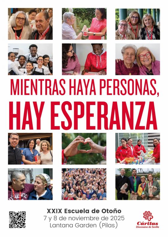 Cáritas Diocesana de Sevilla celebra un año más su tradicional Escuela de Otoño. En esta ocasión, el lema elegido para su vigésimo novena edición es ‘Mientras haya personas, hay esperanza’. El encuentro se celebrará en el Complejo Rural Lantana de Pilas, los días 7 y 8 de noviembre.