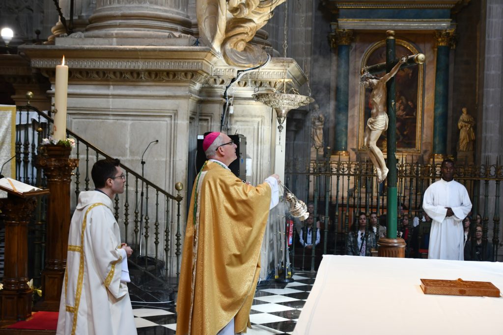 Durante su estancia en la capital gaditana, el prelado presidió el Triduo Pascual en la Catedral. En la tarde del Jueves Santo, ofició la Misa de la Cena del Señor, uno de los momentos más significativos del calendario litúrgico, en la que llevó a cabo el tradicional lavatorio de los pies a varios seminaristas y fieles, gesto que simboliza la humildad y el servicio.