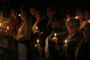 De camino hacia el altar mayor se ha entonado tres veces «Luz de Cristo», mientras se ha levantado el Cirio. En el primer canto, el Obispo ha encendido su candela. Tras entonar el segundo, uno a uno, todos los congregados han encendido las suyas. Una vez en el presbiterio, se ha pronunciado el tercer «Luz de Cristo», mientras se han encendido algunas luces del templo y el Cirio Pascual se ha instalado junto al ambón.