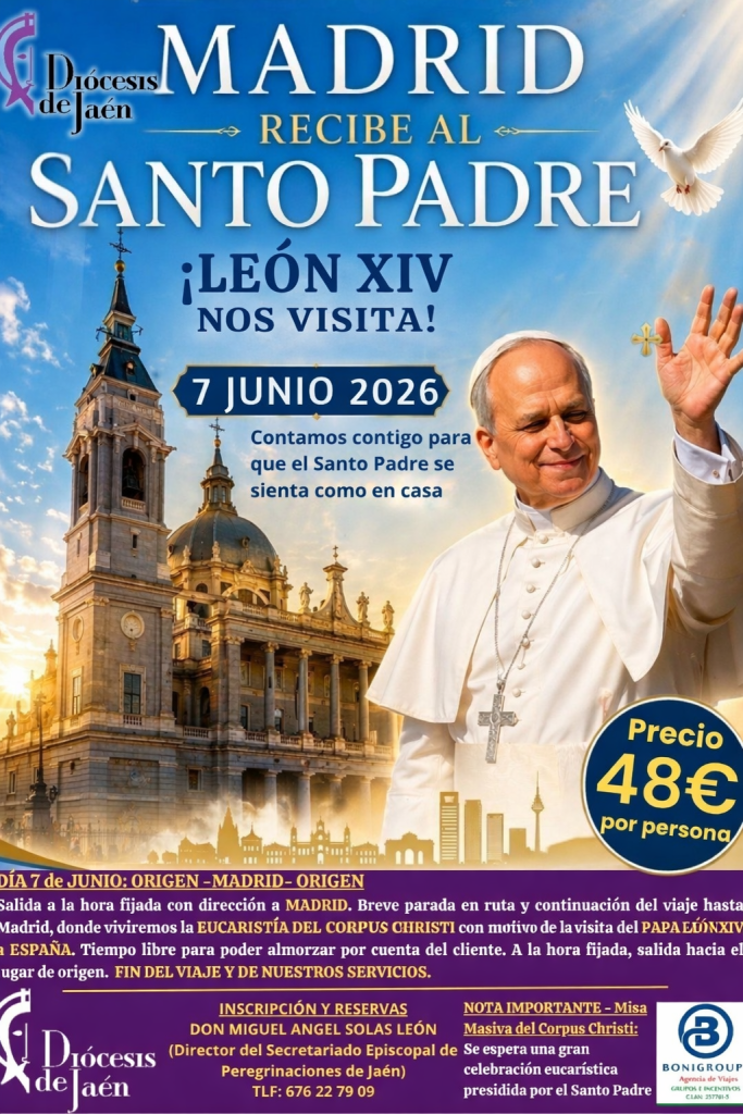 La Diócesis de Jaén ha organizado un viaje a Madrid con motivo de la visita del Santo Padre, León XIV, prevista para el próximo 7 de junio de 2026.
