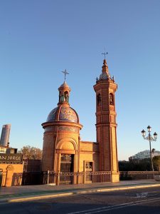 El siguiente proyecto, sin duda el más popular, es la capilla de la Virgen del Carmen, en el Puente de Isabel II. Encargada por el Ayuntamiento en 1924, presenta reducidas dimensiones y se caracteriza por su eclecticismo. Está compuesta por dos elementos bien diferenciados, por un lado, la capilla propiamente dicha, de planta centralizada y cubierta por una cúpula, y por otro, la torre octogonal, unidos ambos por un cuerpo rectangular por el cual se accede. Todo el exterior aparece decorado por cerámica realizada en la Fábrica de Montalván. Como apunta el arquitecto citado, la capillita del Carmen es casi un ideograma formado por la cúpula y la torre, convirtiéndose en un humilladero o cruz de término entre Triana y Sevilla.
