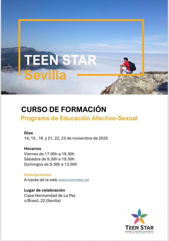 La Parroquia de San Sebastián, de Sevilla, organiza un curso de Teen STAR abierto a todos aquellos que tengan interés en formarse en educación afectivo-sexual. Está especialmente dirigido a aquellas personas que acompañen a jóvenes en el desarrollo de su identidad, entre ellos, educadores, padres, madres y profesores. El curso está previsto los dos últimos fines de semana de noviembre: Del 14 al 16 y del 21 al 23. Con los siguientes horarios: viernes de cinco a siete y media de la tarde; sábado de nueve y media a siete y media de la tarde y domingo de nueve y media a dos y media de la tarde. Los interesados pueden inscribirse en el siguiente enlace.