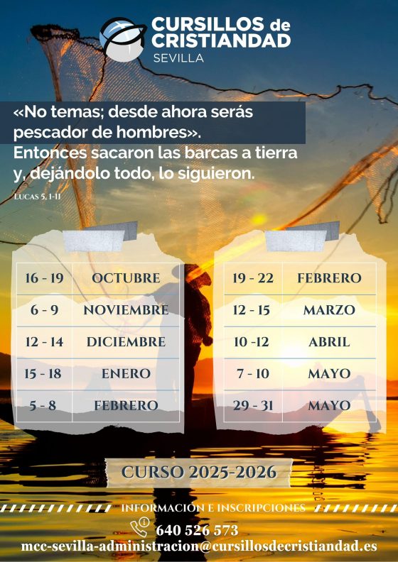 Consulte las fechas de los próximos cursillos en la web diocesana Archisevilla.org. Para mayor información puede contactar a través del correo electrónico mcc-sevilla-administracion@cursillosdecristiandad.es o del teléfono 640 526 573.