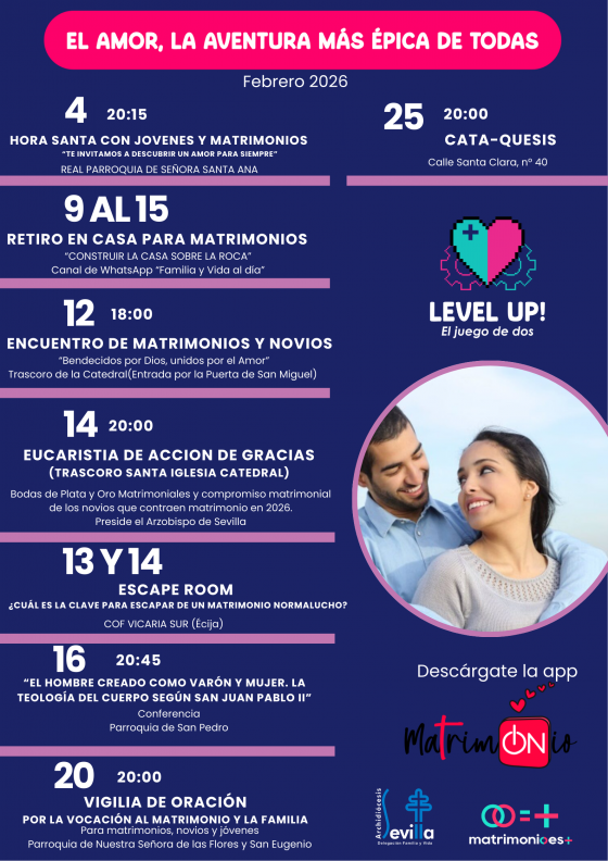 Las actividades de la Semana del Matrimonio continúan con una escape room para novios y matrimonios bajo el título ‘¿Cuál es la clave para escapar de un matrimonio normalucho?’. Organizado por el Centro de Orientación Familiar de la Vicaría Sur, se celebrará en Écija, los días 13 de febrero a las seis de la tarde y el 14 febrero a las once y media de la mañana y a la una de la tarde.