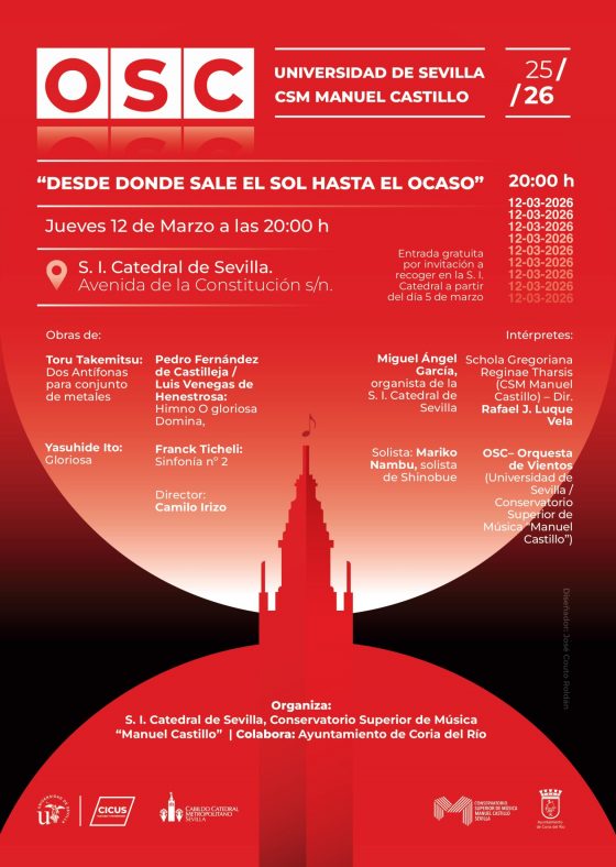 La Catedral de Sevilla, reafirmando su compromiso con la difusión de la cultura y la música, acogerá en el Trascoro el próximo 12 de marzo a las ocho de la tarde el concierto ‘Desde donde sale el Sol hasta el Ocaso’, una interpretación a cargo del Conservatorio Superior de Música ‘Manuel Castillo’. La entrada es gratuita mediante invitación hasta completar el aforo. Las invitaciones pueden recogerse en la recepción de la Catedral.