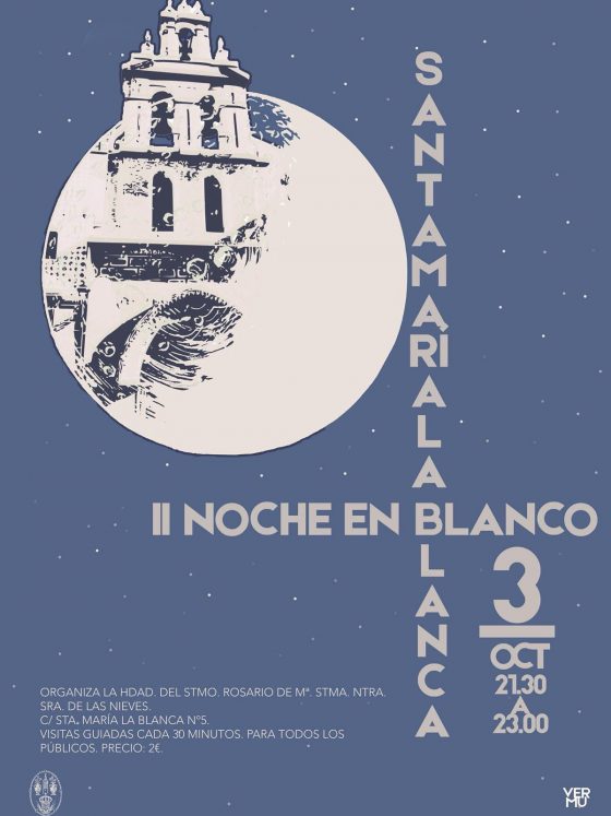 Por su parte, la iglesia de Santa María la Blanca también ofrece visitas esta Noche en Blanco, desde las nueve y media hasta las once. La entrada tiene un coste de dos euros que se destinarán a sufragar los gastos de la salida procesional de la imagen prevista el 19 de octubre. Las visitas guiadas serán cada treinta minutos.