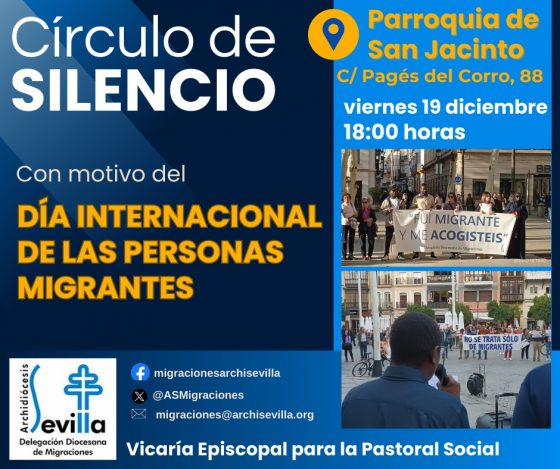 La Delegación Diocesana de Migraciones convoca a un nuevo Círculo de Silencio este viernes 19 de diciembre, a las seis de la tarde. En esta ocasión, se celebrará en la Parroquia San Jacinto, de Sevilla. (Calle Pagés del Corro, 88). Convoca la Vicaría Episcopal para la Pastoral Social a través de la Delegación de Migraciones, con motivo del Día Internacional de las Personas Migrantes.