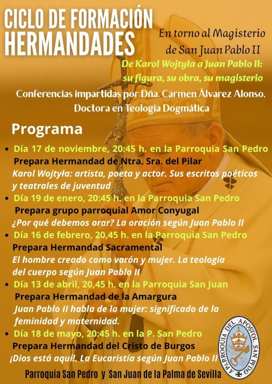 La Parroquia de San Juan de la Palma, de Sevilla, acoge el próximo lunes, 13 de abril, una nueva sesión de su Ciclo de Formación para Hermandades, que este año está dedicando a estudiar el Magisterio de San Juan Pablo II bajo el título “De Karol Wojtyla a Juan Pablo II: su figura, su obra, su magisterio”.