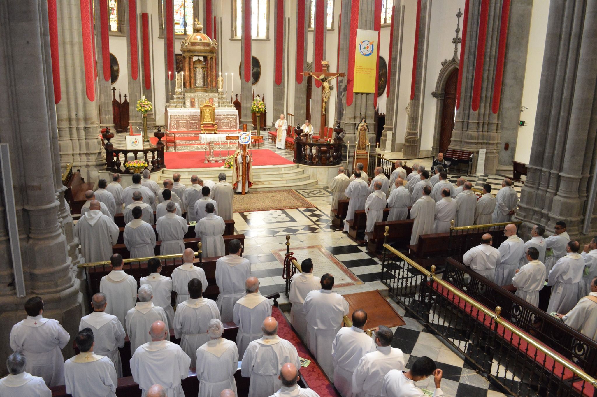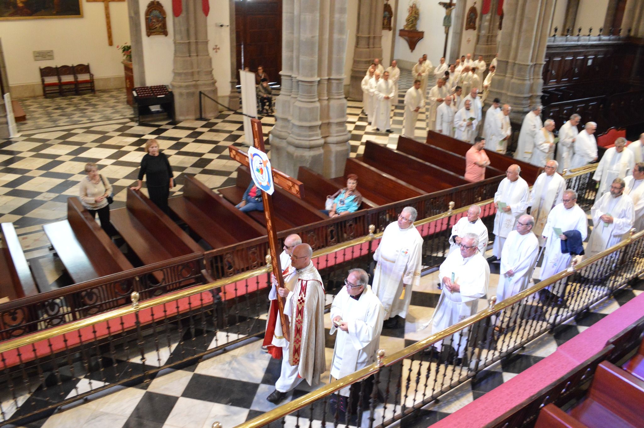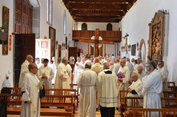 Este miércoles 1 de octubre se ha celebrado el Jubileo del Clero y del Seminario Diocesano en la Catedral de La Laguna. La jornada comenzó en la iglesia de Nuestra Señora de Dolores con la bienvenida por parte del delegado del clero, Juan Antonio Guedes. Posteriormente, en torno a un centenar de sacerdotes venidos de diferentes rincones de nuestra Iglesia particular, y varios seminaristas y diáconos, partieron hasta el principal templo de la diócesis en procesión. En la cabecera de la misma, el vicario general, Antonio Pérez portó la cruz del Jubileo. La misma que se utilizó hace 13 años en Garachico durante el encuentro del Año de la Fe.