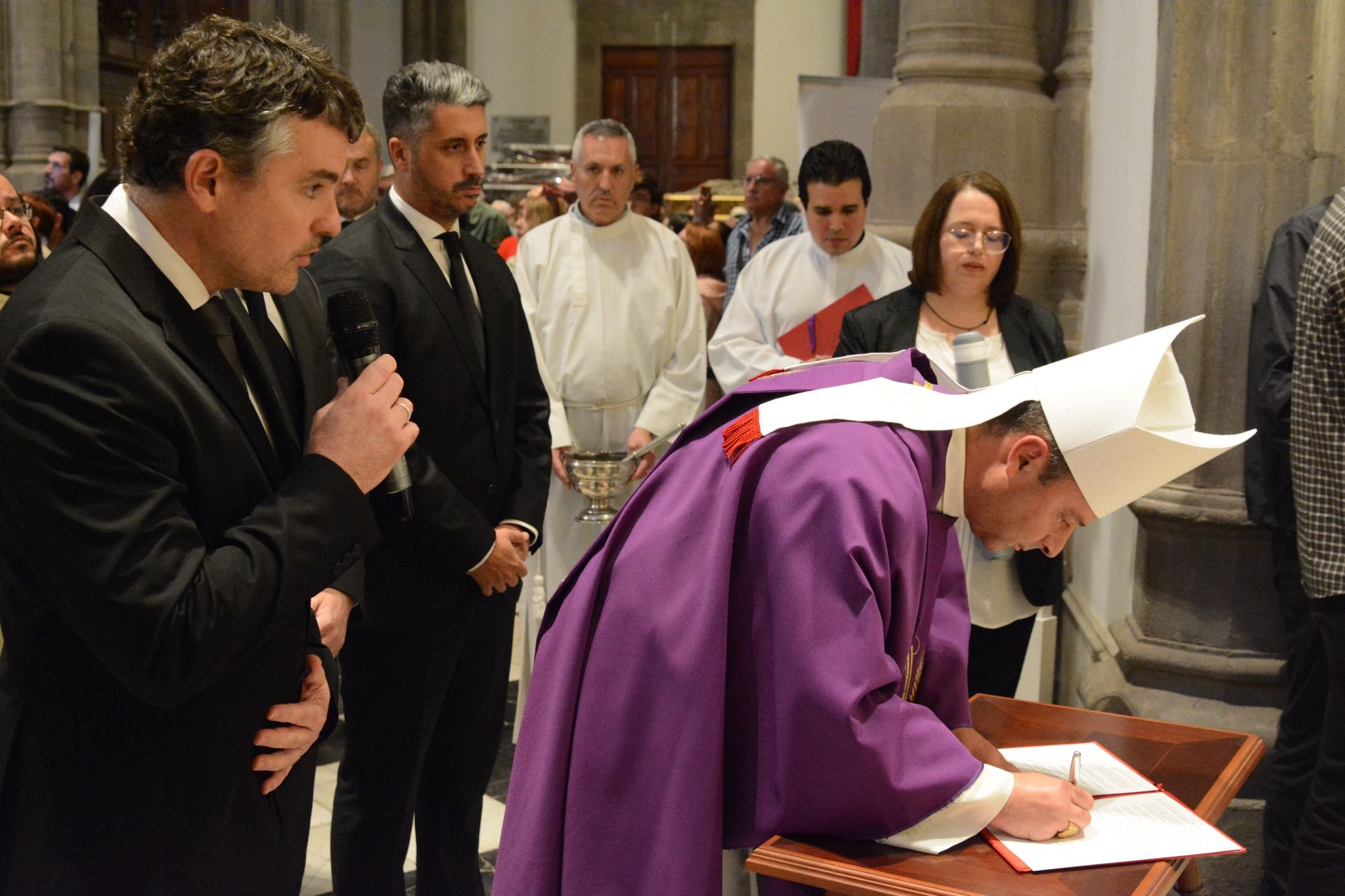 Antes de este momento,  firmaron el acta de sepultura los obispos, Eloy Santiago, José Mazuelos y Cristóbal Déniz; los vicarios generales, Víctor Álvarez y Antonio Pérez; el presidente del Gobierno de Canarias, Fernando Clavijo; el alcalde de La Laguna, Luis Yeray Gutiérrez; el deán de la Catedral, Juan Pedro Rivero; la hermana del obispo emérito, Milagros Álvarez, y el canciller del obispado, Juan Carlos Jorge, quien depositó en el interior del féretro, siguiendo la tradición, una copia del acta, junto con la biografía e historial eclesiástico de D. Bernardo, prensa del día y dinero de curso corriente en billetes y monedas.
