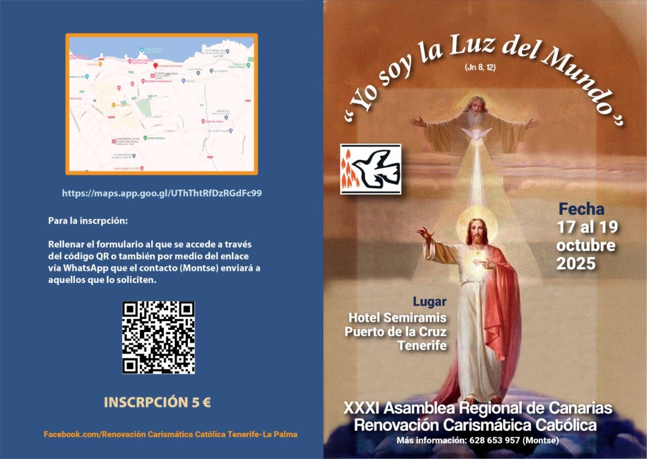 Del 17 al 19 de octubre tendrá lugar la XXXI Asamblea Regional de la Renovación Carismática Católica de Canarias, en el Hotel Semiramis del Puerto de la Cruz. En esta ocasión, animarán las jornadas el Padre Javier Ramírez, asesor nacional de la Renovación Carismática y Salvatore Martínez, predicador laico a nivel internacional y profesor universitario en Roma.